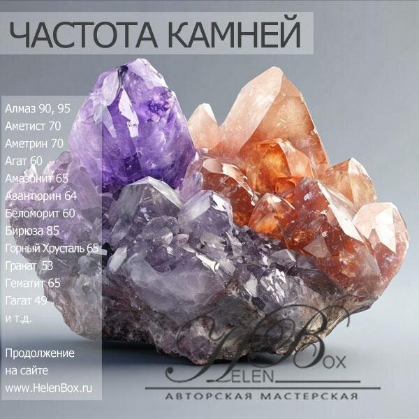 (в том числе по данным из книги Г. Климович «2 энергии — 2 пути к здоровью») Данные из Интернета (ГГц) Мои замеры (ГГц) Алмаз 90, 95 ГГц — Аметист 70 ГГц 65 Аметрин 70 ГГц — Агат серый 60 ГГц Агат переливт 73 ГГц Амазонит 65, 70 ГГц Авантюрин (красный) 64 ГГц Беломорит 60, 64 ГГц Бирюза 85, 90 ГГц Везувиан 80 ГГц Горный Хрусталь 65 ГГц 65, 80 Гранат Альмандин 53, 75, 80 ГГц Гематит 65-70 ГГц Гагат 49-55 ГГц Гипсовая роза 63 ГГц Дымчатый Кварц 55-65 ГГц Дымчатый Кварц с включениями Рутила 61 ГГц Жадеит 70 ГГц Жаманшинит (шар 47мм) 81 ГГц Змеевик, шар 65мм, Урал 60 ГГц Исландский шпат 64 ГГц Кварц с включениями Турмалина 65 ГГц 65 ГГц Кварц розовый 60, 68 ГГц Кварц с включениями Хлорита 60 ГГц Кианит 80 ГГц Коралл 69 ГГц Клинохлор 70 ГГц Кальцит 60 ГГц Кварцит зеленый 60 ГГц Ларимар 81 ГГц Лепидолит, шар 60мм. 65 ГГц Ливийское стекло 70 ГГц Малахит 65, 71 ГГц Натролит 55 ГГц Нефрит зеленый 65 ГГц Нефрит белый 70 ГГц Нефрит черный 55, 60 ГГц Обсидиан 55 ГГц Оникс мраморный, яйцо, зеленоватое 80 ГГц Пирит 59 ГГц Рубин 75, 80 ГГц Сердолик 56, 71 ГГц Соколиный Глаз с Гематитом 65 ГГц Сиреневит / катаранскит, шар 65мм. 58 ГГц Сколецит, жезл 66 ГГц Тигровый Глаз 65 ГГц Турмалин черный (Шерл) 52, 63 ГГц Унакит, яйцо 53, 54 ГГц Флюорит желтый, шар 50мм. 77, 80 ГГц Цитрин 70 ГГц Чароит 70, 72 ГГц Шунгит 46, 60 ГГц