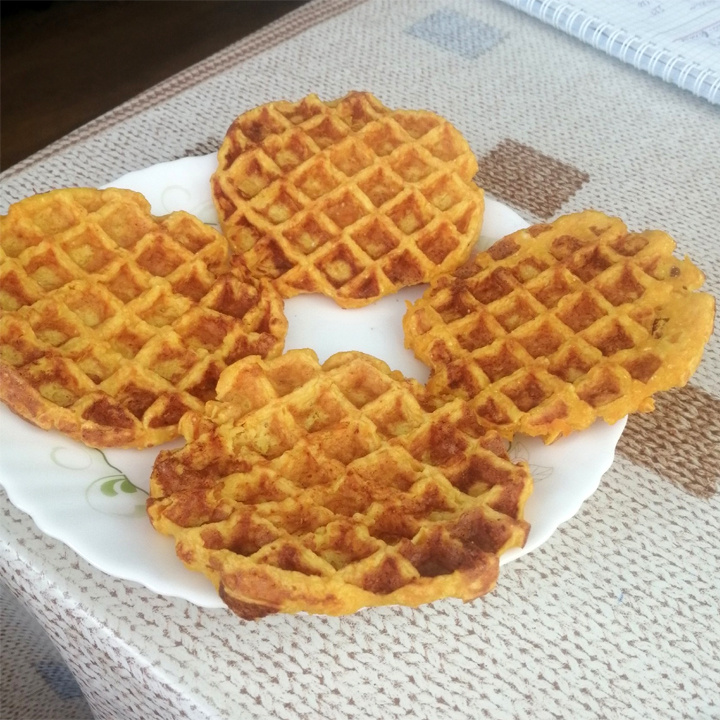 ✔ Тыква - 150 г; ✔ Творог - 100 г; ✔ Кефир - 100 г; ✔ Яйцо – 1 шт.; ✔ Мука нутовая – 25 г; ✔ Мука овсяная – 25 г; ✔ Разрыхлитель - 5 г; ✔ Соль – щепотка; ✔Сахарозаменитель – по вкусу. Тыкву натереть на мелкой тёрке. Творог (у меня – 1% жирности), кефир, яйцо, тыкву смешать. Я «пробила» блендером, но можно просто вилкой. В творожную массу добавляем сухими ингредиенты. Хорошо перемешать, и тесто готово. Выпекаем в вафельнице. У меня получилось 7 штук, но для фото осталось только 4. Примерное КБЖУ на 100 г - 97/7,9/2,6/10,7. Рецепт на странице Автор рецепта – Татьяна Симакова Расчёт КБЖУ сделан с помощью Telegram-чат-бота https://t.me/vesipitaniebot © Почтенный возраст Online и Рецепты для диабетиков