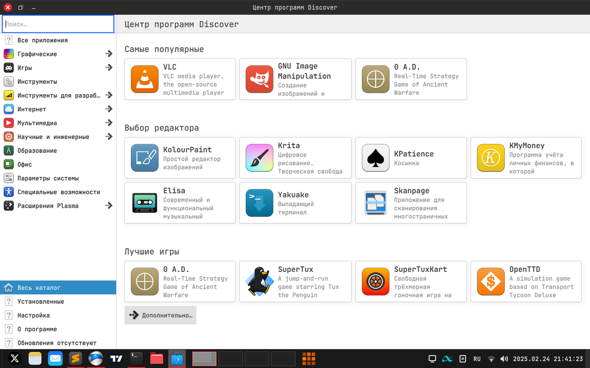 Обновления в Discover подтягиваются автоматически: Apt-пакеты обновляются через системный менеджер, Flatpak — через Flathub, а Snap — через snapd.