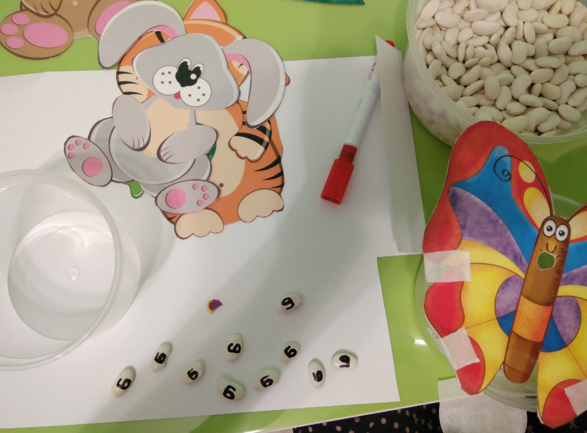 Высыпала фасоль на поддон и на некоторых бобах (насколько хватило терпения) написала буквы или цифры маркером. Сначала буквы быстро стирались, но я нанесла на них капельку лака для ногтей — так они стали держаться лучше. Правда, сын на следующий день всё равно уловил лёгкий запах лака! Потом перемешала фасоль с буквами среди обычной, чтобы ребёнку было интереснее их находить. У меня были завалявшиеся картинки животных из старого набора для аппликаций — те, что идут как примеры на обложке. Я их заламинировала и вырезала, пожалев выбрасывать, и вот они пригодились! Каждую картинку прикреп