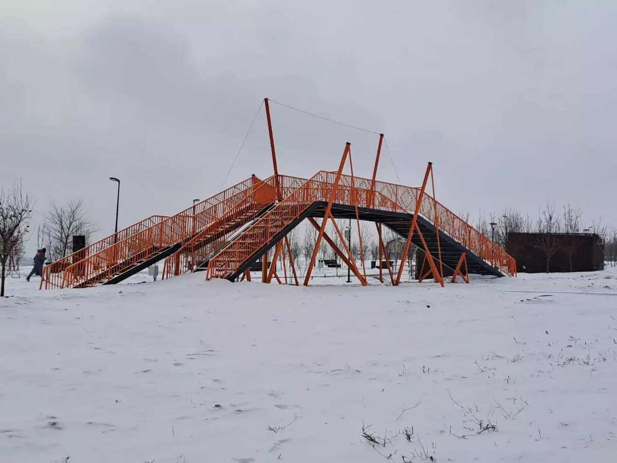 Расположенный на входе в парк им. 70-летия Победы в Великой Отечественной войне мост длиной 25,5 м и высотой 3,5 м имеет уникальную особенность, обеспечивающую эффективное разведение потоков велосипедистов и пешеходов на разных высотах. Благодаря такой конструкции сооружения болельщики смогут с максимально близкого расстояния безопасно следит