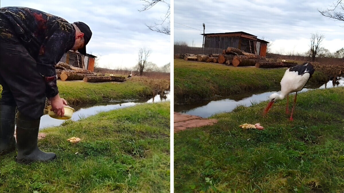 «Издалека узнаёт» — На Витебщине мужчина всю зиму подкармливал аиста, не улетевшего на юг — Видео