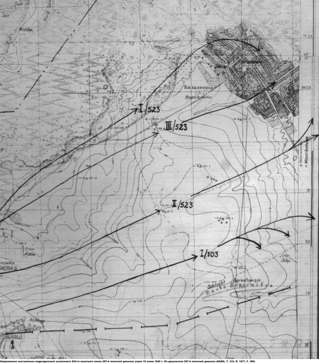 Главный удар южной группировки немецкой 6-й полевой армии 10 июня 1942 г. пришелся на стык 28-й и 38-й армий по 277-й и 300-й стрелковым дивизиям, против которых только в 1-м эшелоне были сконцентрированы 44-я, 71-я и 297-я пехотные дивизии 51-го армейского корпуса. Левофланговая 297-я пехотная дивизия выставила для наступления свои 523-й и 524-й пехотные полки, которые должны были атаковать на Базалеевку (ныне с. Базалиевка) и Богородичное (1,7 км западнее с. Приморское) на флангах 277-й и 300-й дивизий соответственно.