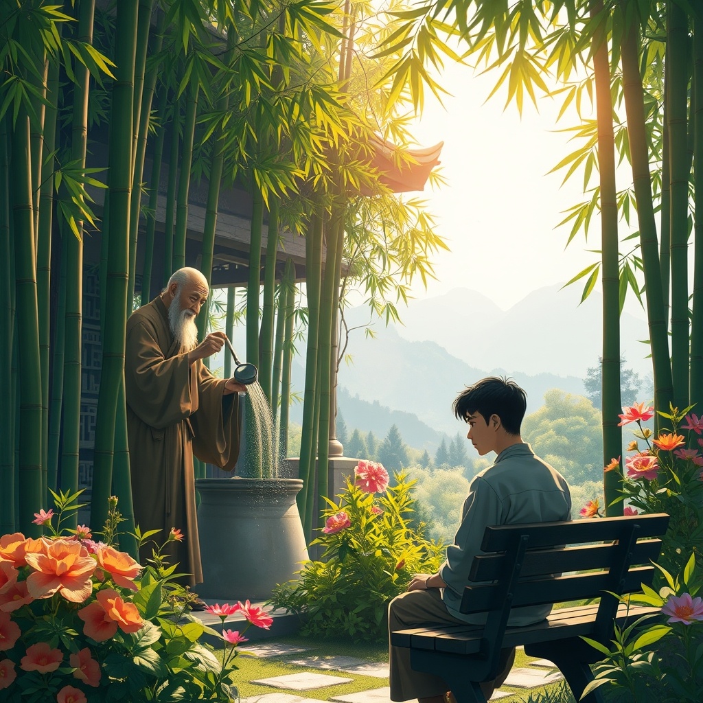 В тихой деревне, окружённой горами и реками, находился древний храм. Здесь, среди цветов и высоких бамбуков, жил старый монах по имени Хару. Его дни проходили в медитации, уходе за садом и редких беседах с теми, кто приходил за советом. Однажды к храму пришёл молодой человек, по имени Кенджи. Его сердце было полным беспокойства, а разум — переполнен вопросами. Он искал ответы и надежду, надеясь, что мудрость Хару поможет ему обрести покой. — Учитель, — начал Кенджи, когда нашёл монаха в саду, — я чувствую себя потерянным и не знаю, какой путь выбрать в жизни. Внутри меня бушует буря, и я не могу найти путь к спокойствию. Хару, не отрываясь от полива цветов, указал на скамейку рядом с собой. — Сядь, постой со мной в тишине, — сказал он. Кенджи послушно сел, но его беспокойный ум не утихал. Он заметил, как солнечные лучи играли на листьях бамбука, как ветер нежно шевелил их стройные стебли. — Посмотри на бамбук, — вдруг сказал Хару. — Что ты видишь? — Он гибок и устойчив, — отве