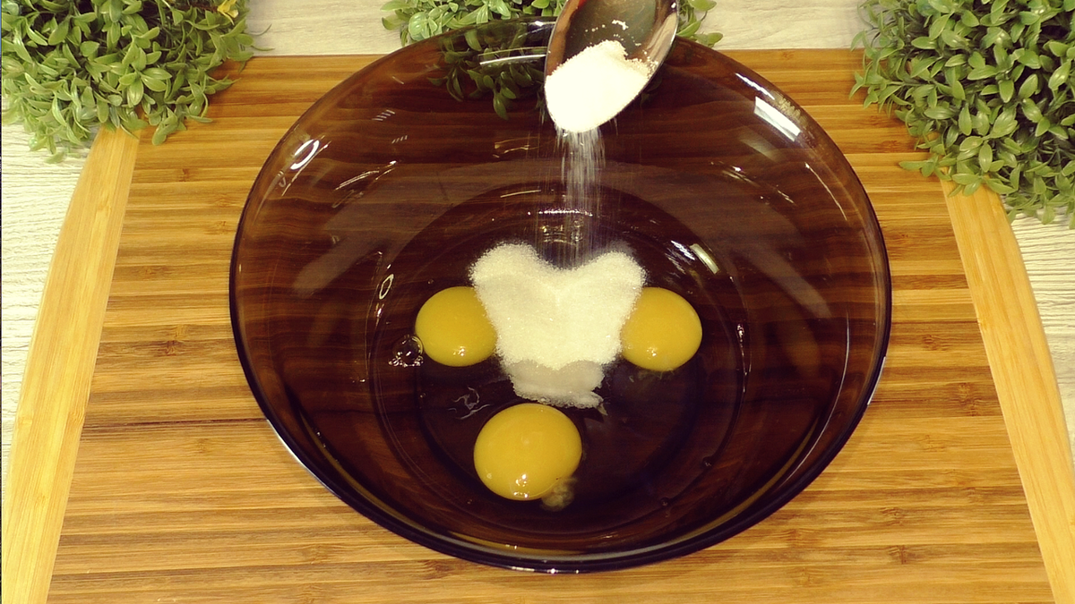 В миску, в которой будем замешивать тесто, добавляем яйца, высыпаем сахар и соль. Все хорошо перемешиваем венчиком. Я добавляла 2 ст. л. сахара и 0,5 ч. л. соли — на мой вкус получилось идеально. Ориентируйтесь по своему вкусу. Если будете подавать со сладкими добавками, количество соли и сахара сократите.