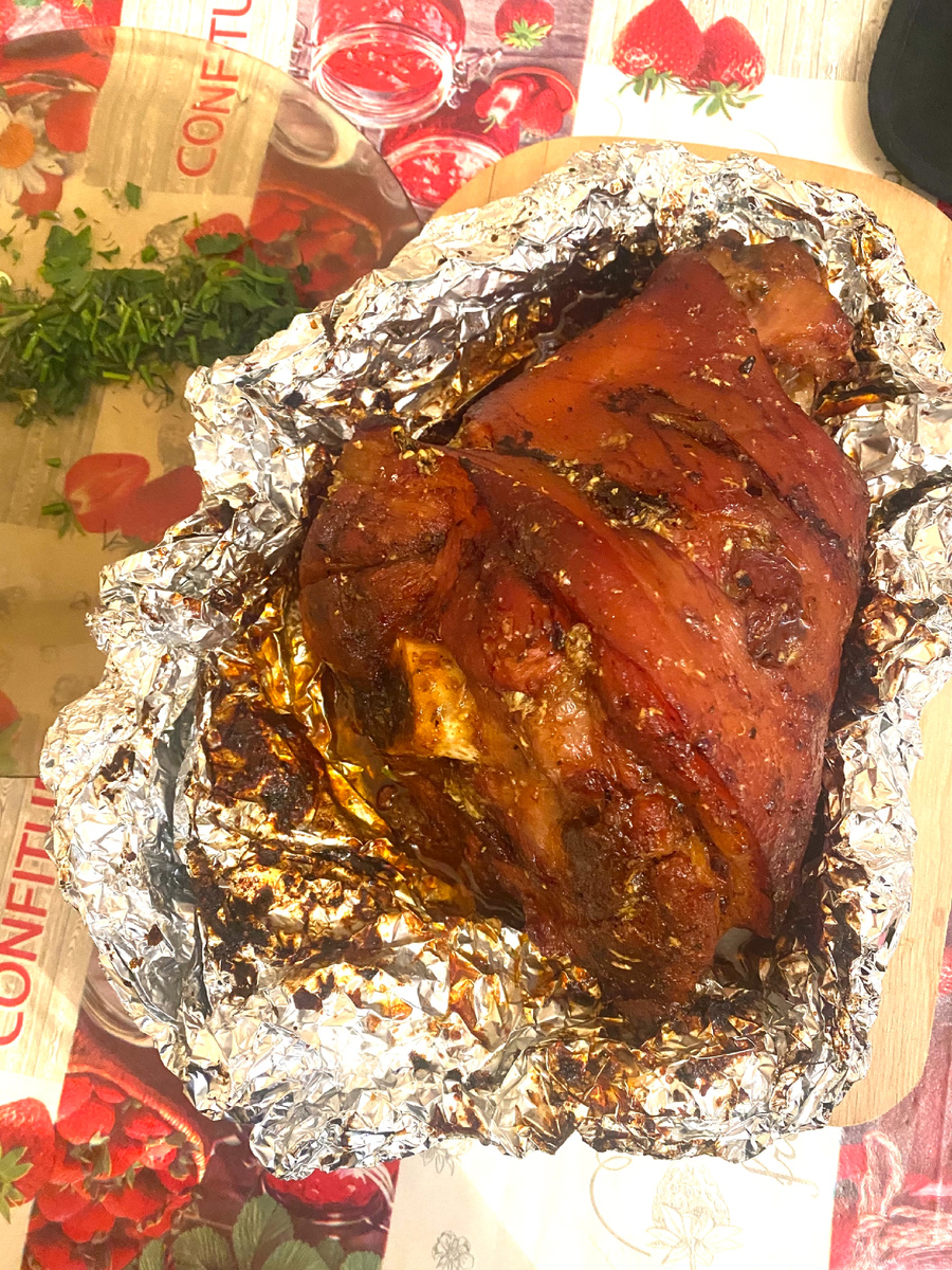 Рульку обожаю. Покупаю в мясном магазине , около дома 🏘. Сразу же промываю , делаю надрезы на шкуре 3-4 раза , беру масло + специи натираю и оставляю на 2-3 часа . Беру фольгу , прячу в ней свою рульку 😀 накрываю крышкой из фольги , и на 220 градусов в духовку на 1,5 часа . Потом уменьшаю до 200 градусов , оставляю на 30-40 мин , фольгу не снимаем - просто проверяем . 😊 Смотрите , внутри рульки - сочное мясо 🍖. Мы не кушаем шкуру , мы ее оставляем для животных , или же просто прощаемся с ней 😉. К рульки люблю зелень . Буду рада подписке 🤓