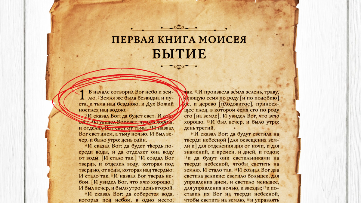 Первые стихи Библии известны многим - в начале Бог сотворил небо и землю, земля была безвидна и пуста, была тьма над бездною, божий дух летал над водой, и Бог создал свет. Благодаря этим стихам верующие полагают, что в начале был только Бог, который создал мир из ничего. Однако исследователи библейского текста утверждают, что этот перевод неправильный. Давайте сравним классические переводы первого стиха Библии. Синодальный перевод предлагает нам следующий вариант. В начале сотворил Бог небо и землю. Земля же была безвидна и пуста, и тьма над бездною, и Дух Божий носился над водою. И сказал Бог: да будет свет. И стал свет. (Бытие 1:1-3) Новый русский перевод дает тот же перевод. Библия короля Иакова, Вульгата и многие другие переводы Библии дают тот же самый стих. Если взять перевод, данный в русскоязычном Танахе (Ветхий Завет, священный текст иудеев), то первый стих будет выглядеть иначе: В начале сотворения Элохим неба и земли. Мир был безвидным и необитаем. Мрак покрывал (водную) пу
