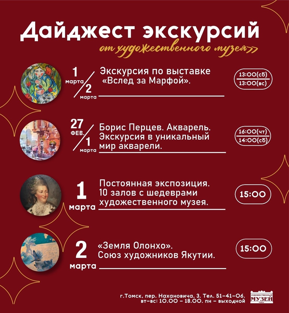 Экскурсия по выставке "Вслед за Марфой". ●В субботу, 1 марта, в 13.00. ●В воскресенье, 2 марта, в 13.00. Стоимость экскурсии - входной билет на выставку + 150 руб. на кассе. Купить билет: clck.ru/3GRnRQ Экскурсии по выставке Бориса Перцева. Акварель. ●В четверг, 27 февраля, в 16.00. ●В субботу, 1 марта, в 14.00. Экскурсию проведёт Ханова Дарья Александровна - специалист экспозиционной и выставочной деятельности. Стоимость экскурсии - входной билет + 150 руб. на кассе. Купить билет: clck.ru/3G2Dfa Субботние кураторские экскурсии по постоянной экспозиции. ●В субботу, 1 марта, в 15.00. Экскурсии проходят каждую субботу по залам «Западноевропейское искусство XVI – нач. XX века», «Русское искусство XVIII – нач. XX века» и «Иконопись». Участники группы увидят картины таких известных художников как Тропинин, Кипренский, Клодт, Поленов, Верещагин, Серов, Кустодиев, Коровин, Гуркин, Суриков, Айвазовский, Кончаловский, Лентулов, а также редкую коллекцию картин художников Голландии, Фландрии, И