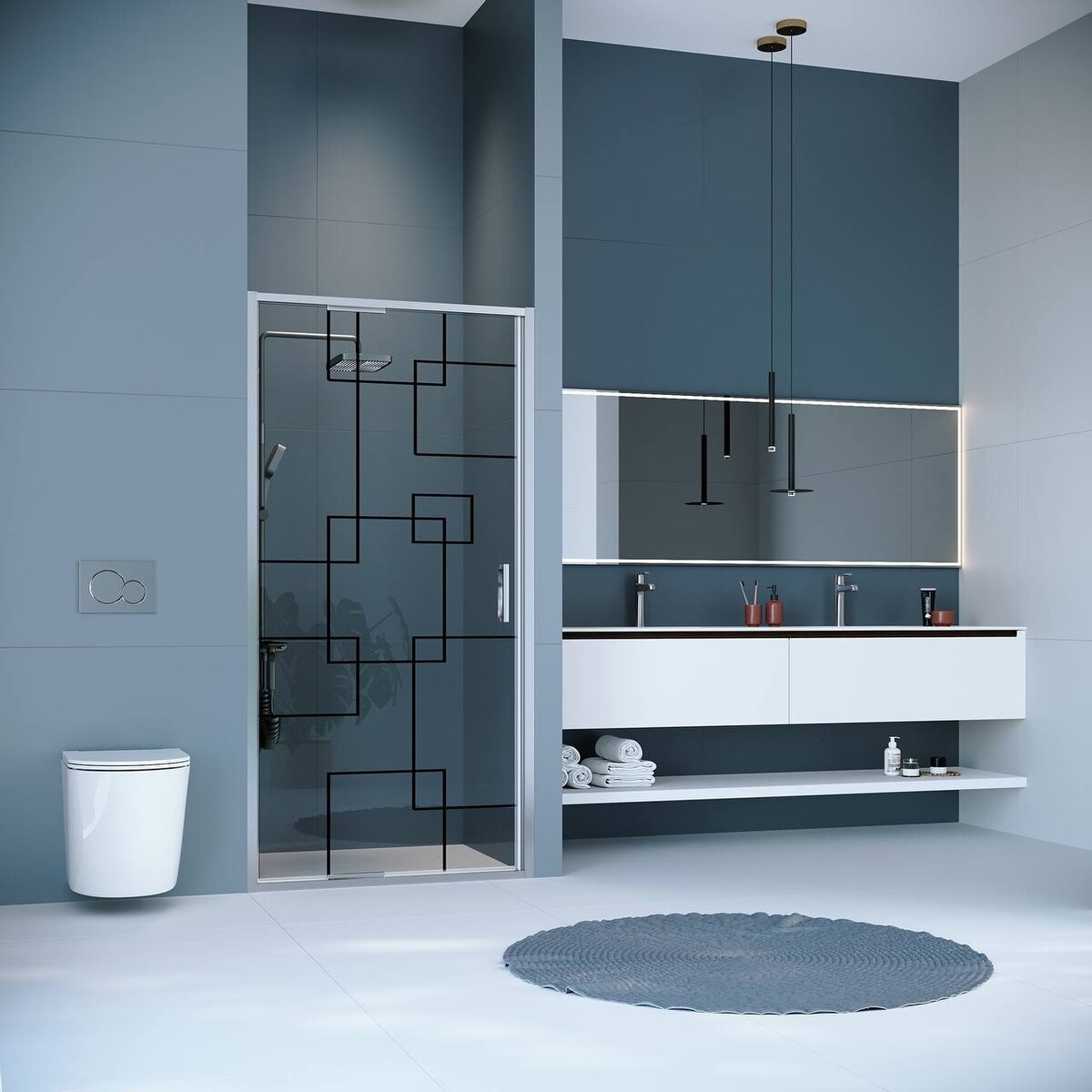 - Закаленное стекло толщиной не менее 6 мм обеспечивает прочность и безопасность. Прозрачное стекло визуально увеличивает пространство, а матовое или узорчатое — обеспечивает приватность.