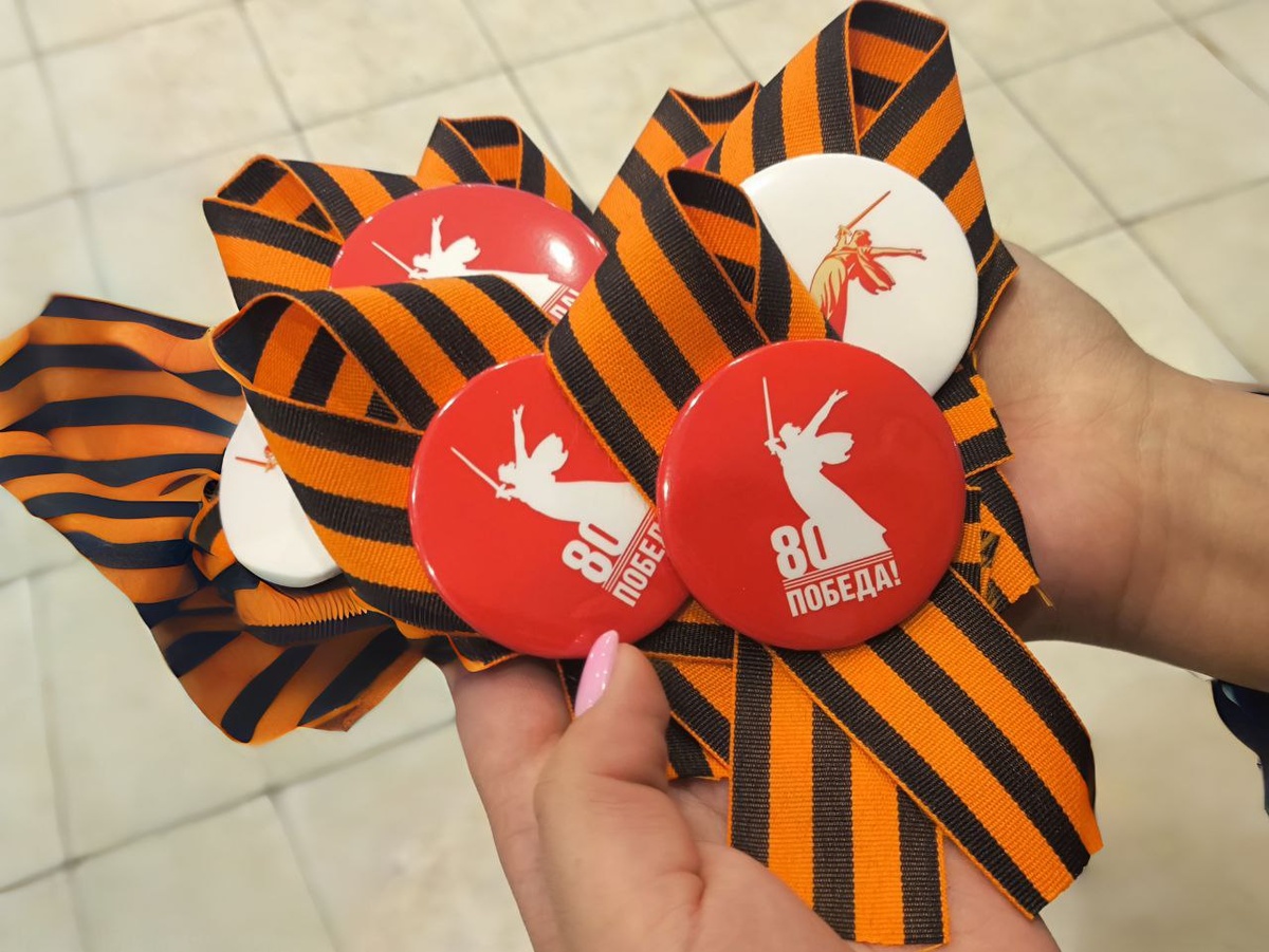 Перед торжественным запуском обратного отсчета, отмеряющего дни до 9 мая 2025 года, волонтёры угледобывающего предприятия прикрепили всем участникам акции георгиевские ленточки со значками, на которых изображен официальный логотип юбилейного года – силуэт монумента «Родина- мать зовет!».