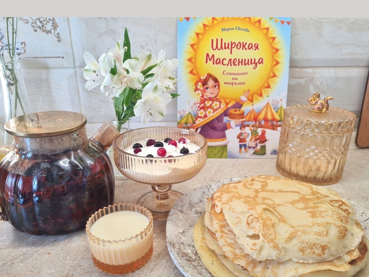 Что ж Масленичная неделя началась, а значит время – делиться проверенным рецептами блинов и с удовольствием их дегустировать!😉 Мы начали с классики на молоке (160 г муки, 500 мл молока, яйцо с1 - 3шт., раст. масло 50 мл., соль сахар), ещё хочу попробовать на кефире с кипятком, говорят тогда блины получаются очень тонкие☺️… Дети наперебой лезли помочь, приходиться каждое действие «делить»: ты одно яйцо разбиваешь, ты – другое, ты взбиваешь, а ты держишь плошку и т.д. Нравится, что у них формируется такой интерес к приготовлению еды, надеюсь потом не сойдет на нет.😄 Так вот, после вкусного чаепития самое время почитать что-то по теме – мониторила, что есть про Масленицу для детей, нашла в принципе единственный подходящий вариант – книга Марии Евсеевой «Широкая Масленица. Солнышко на тарелке". Бодрая и звонкая история о том, как в садике воспитательница рассказывает детям о празднике. Что понравилось: 1️⃣ритмичный слог на "русско-народный лад": «И пришла Масленица к людям. Но не той сте
