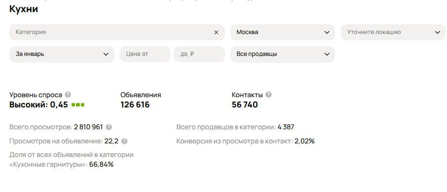 При планировании рекламной кампании на Авито необходимо выбрать модель оплаты: за просмотры или за размещение. Рассмотрим расчет бюджета для товара «Кухни» в Москве с целью получения 100 лидов за месяц. Важно учитываем только Москву. Сначала нужно определить, сколько контактов приносит одно объявление в нужной категории. Это можно узнать через Аналитику Авито, обратив внимание на показатель Уровень спроса. Также необходимо выяснить, сколько просмотров получает одно объявление — эту информацию тоже можно взять из аналитики. - Уровень спроса: 0,54 контакта на одно объявление за месяц.