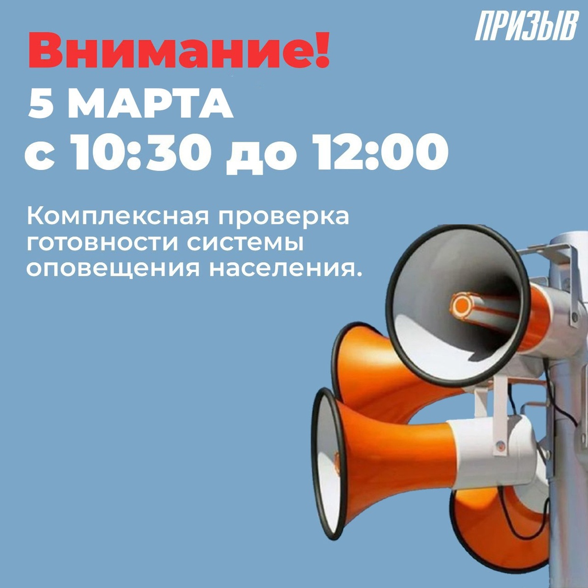 5 марта 2025 года с 10:30 до 12:00 пройдет плановая проверка системы оповещения населения. В ходе проверки будет произведен: - Запуск электросирен с сигналом «Внимание всем». - Передача речевых сообщений через мощные громкоговорители. - Информационные сообщения на телеканалах. Будьте внимательны! Это тренировочная проверка.