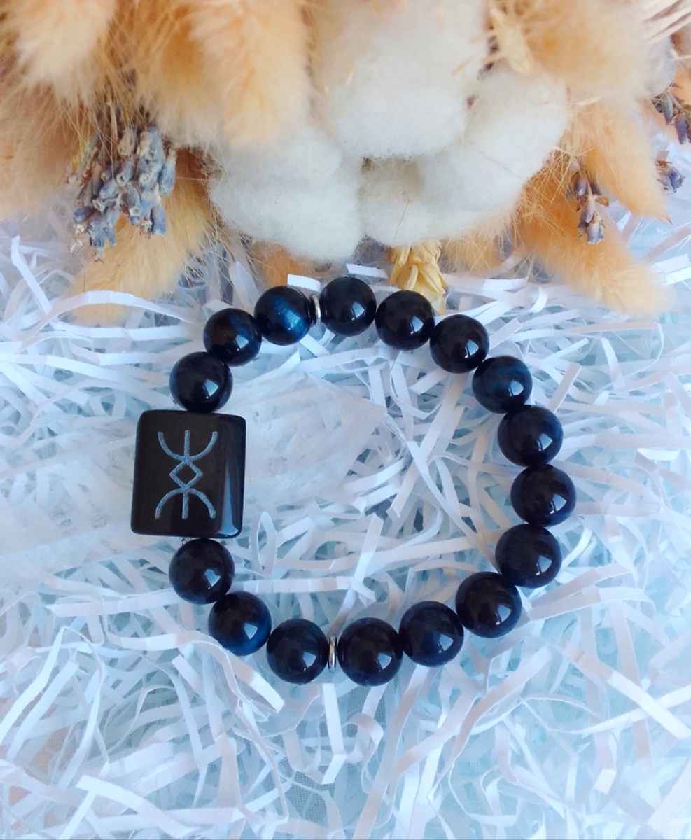 Браслет состоит из натурального камня соколиный глаз и руны «Достаток». Русская руна «Достаток» является мощным амулетом, привлекающим в жизнь человека денежное благосостояние, а также повышая его самооценку и делая его самодостаточной личностью, наполняя её духовными знаниями. Руна «Достаток» помогает как для привлечения богатства, так и всего, о чём думает человек и в чём он нуждается: новые знания, их усвоение, расширение профессиональных навыков, здоровье, укрепление физических сил, бодрости тела и духа, любви, моральных сил для решения имеющихся проблем. Соколиный глаз помогает обрести интуицию, веру в себя и в свои силы, ясность мышления и уверенность в принятии решений, направляя мысли в продуктивное русло. Для тех, кто стоит на перепутье или ищет ответы на сложные жизненные вопросы, камень поможет лучше воспринимать подсказки Вселенной и доверять своему внутреннему голосу. Обладает способностью снимать страхи и фобии, особенно те, которые связаны с полётами или высотой. Эт