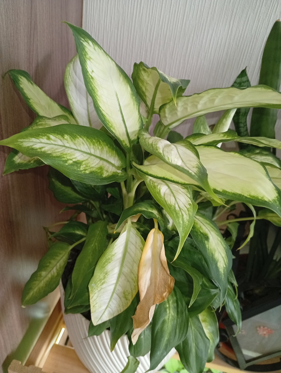 Почему я не спешу удалять испорченные листья с комнатных растений? У меня всего лишь два оправдания этому поступку. Конечно,засохшие листья можно сразу удалять для эстетичного вида растения, и во избежании расселения вредителей и болезней. Но тут то и обратная сторона. Я наблюдаю, сколько листов сушит растение от общей зелёной массы. Вот к примеру,диффенбахия "Камилла", пока портит 2 листа на одном побеге. Жду от нее дальнейшего сигнала о необходимости проверить корешки, если новых таких листьев не будет, фуф...значит отделалась легким испугом. Еще следует иметь в виду, что процесс отмирания листвы комнатных растений по мере их взросления это нормально. К примеру, нижние листья у диффенбахии начинают отмирать примерно на второй год жизни растения, моей как раз 2 года в апреле будет. Но тут еще надо смотреть, как именно портит растение листья, исключит факты заболевания или поражения вредителями. Вторая причина это то, что такие листочки по мере увядания отдают растению питание.