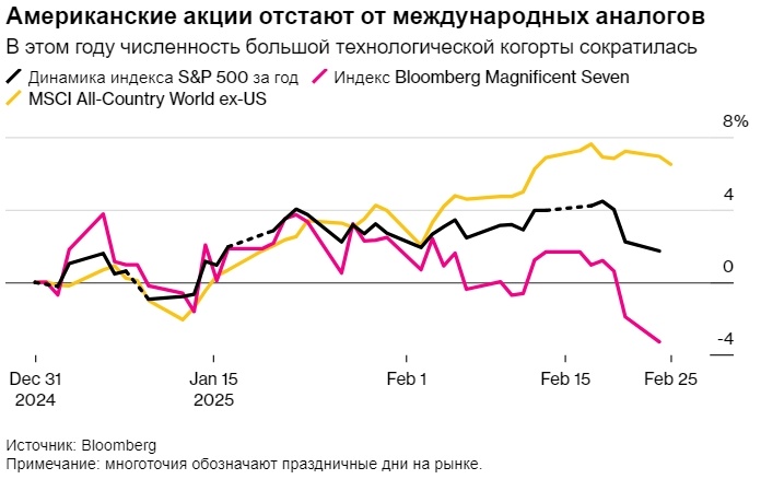Стратег говорит, что сомнения растут, поскольку Европа и Китай выглядят лучше. Ожидает фискальных мер, если S&P упадет на 6% По мнению Майкла Хартнетта, стратега Bank of America Corp., среди инвесторов растёт беспокойство по поводу перспектив дальнейшего роста индекса S&P 500. В то же время европейские и китайские акции демонстрируют впечатляющую динамику. «Чем дольше S&P не может достичь новых максимумов, тем больше сомнений», — отметил Хартнетт в интервью Bloomberg TV. «Европа растет, Китай растет, даже облигации в Америке начинают расти». В этом году стратег рекомендует инвестировать в международные акции, а не в американские аналоги. Он ожидает, что акции так называемой «Великолепной семёрки» технологических компаний потеряют позиции после того, как они стали движущей силой роста в США с начала 2023 года. По словам Хартнетта, инвесторы не настроены пессимистично в отношении крупных технологических компаний, но эти акции уязвимы к снижению, если ситуация на рынке не улучшится. Амери