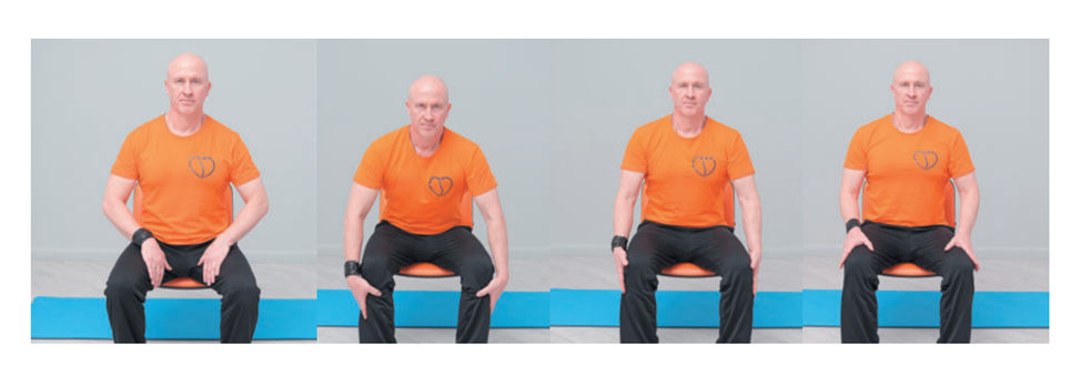 ИСХОДНОЕ ПОЛОЖЕНИЕ: Садимся ближе к краю стула, чтобы спина не опиралась на спинку. Спина прямая, плечи опустить, лопатки сведены. Взгляд вперед. Руки лежат на коленях. ТЕХНИКА ВЫПОЛНЕНИЯ: 1. Вначале сделаем небольшой самомассаж. Руки кладем сверху на бедра и выполняем круговые движения вокруг колена.