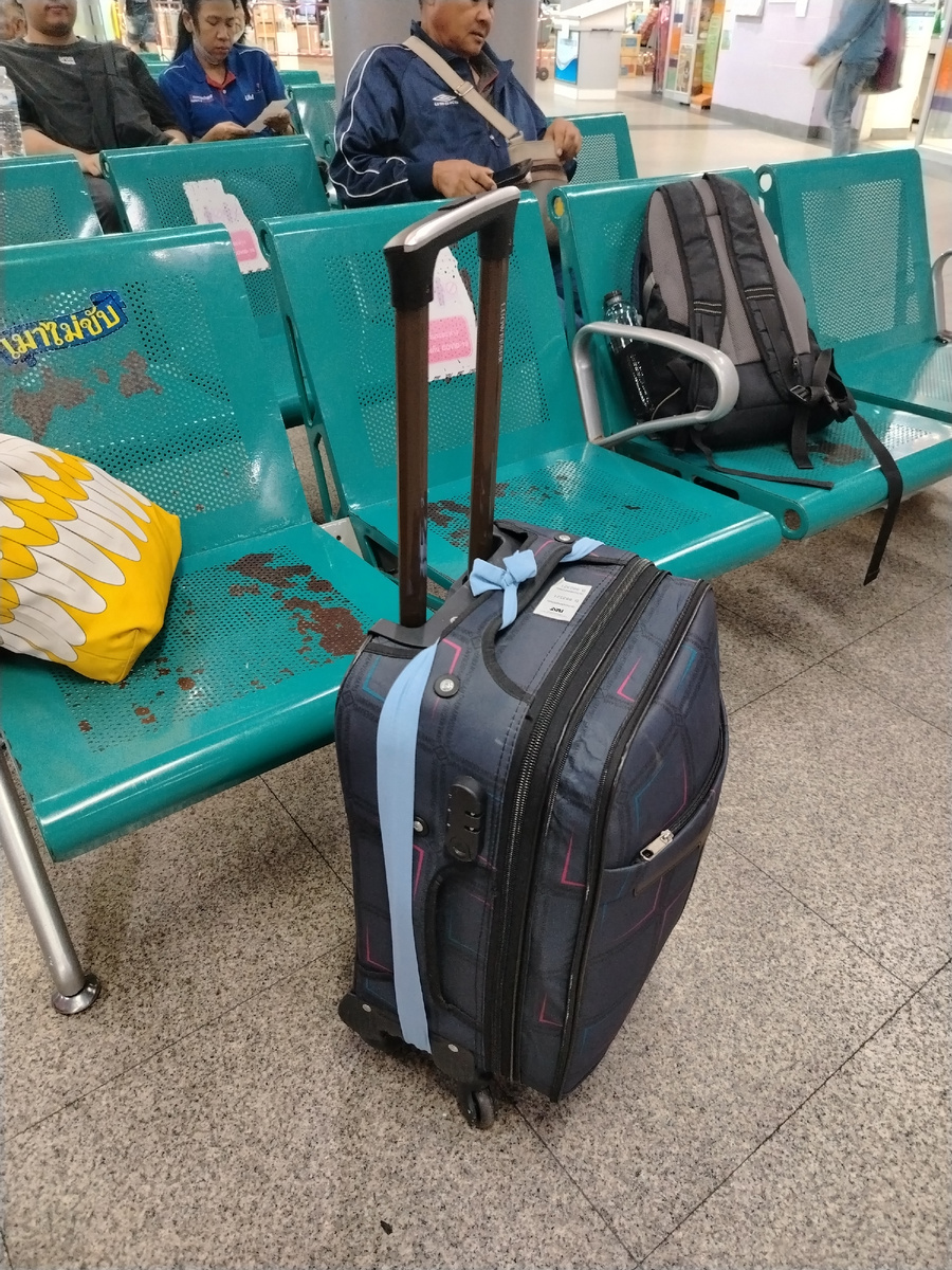 В пути у меня случилась неприятность с чемоданом. У меня практически отлетело одно крепление с двумя колесами. Из 4 болтов, которыми оно крепилось к чемодану, три раскрутились и потерялись. Поэтому, чтобы не потерять это крепление совсем, мне пришлось взять пояс от моего пляжного халата и привязать им крепление. Так что теперь у меня чемодан с ленточкой.