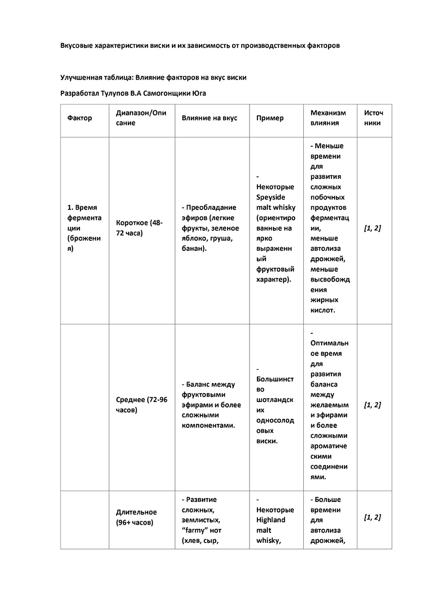 “Эта таблица разработана Тулуповым В.А. и предназначена для широкого круга читателей, интересующихся производством и вкусовыми характеристиками виски: Таблица основана на научных исследованиях и проверенных источниках, указанных в списке литературы. Она представляет собой систематизированную информацию о влиянии различных факторов производства виски на его вкус и аромат. Скачать полную версии таблицы PDF