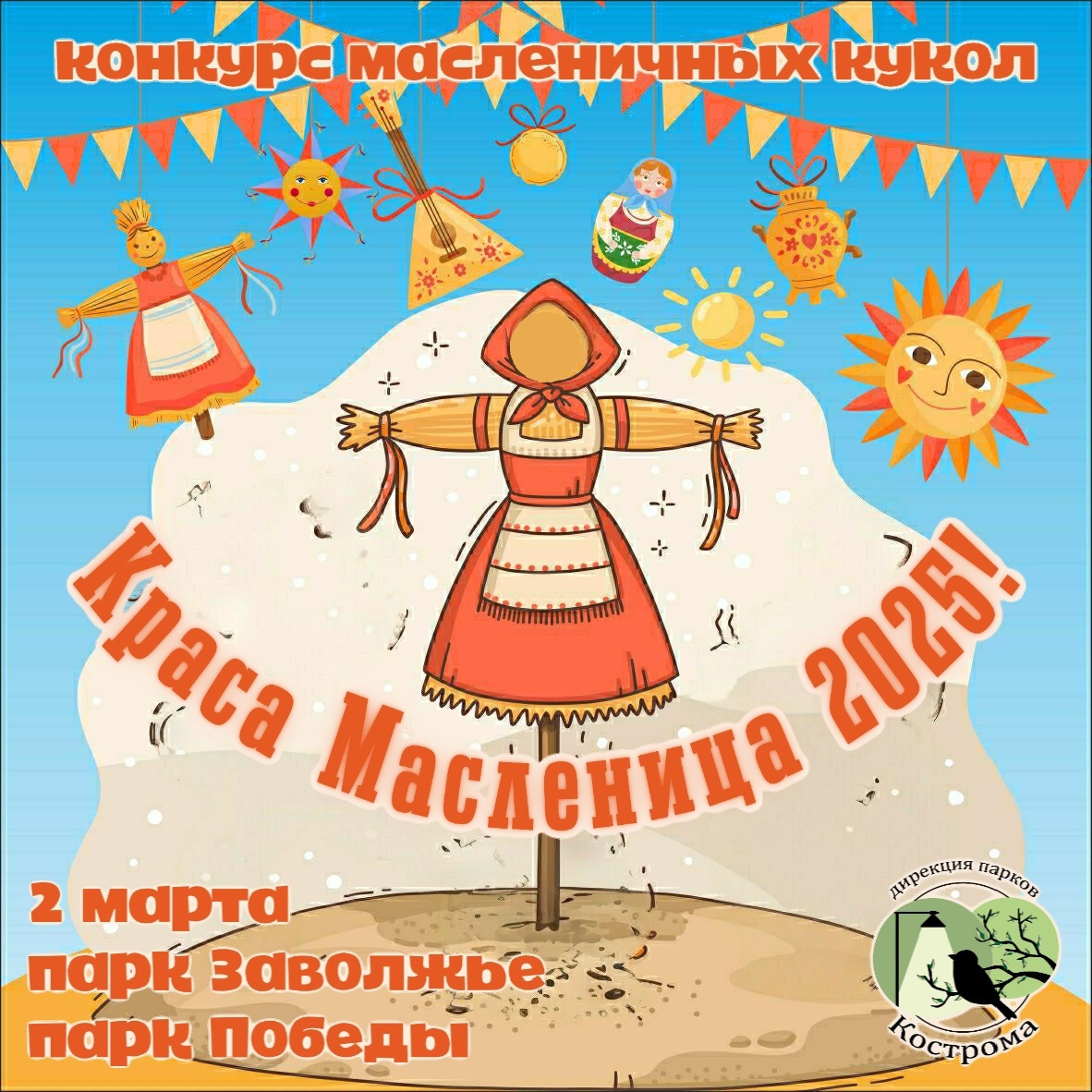 Конкурс масленичных кукол пройдет в парках города Костромичей просят проявить таланты и поучаствовать в очередной конкурсе на Масленицу, итоги которого подведут уже в эти выходные, 2 марта. Об этом сообщает Дирекция парков города. Традиционный конкурс в Костроме проходит каждый год. На этот раз победителям обещают крутой подарок в качестве награды. Смастерить обрядовую куклу костромичам нужно из безопасных материалов. Ростом она должна быть не менее полутора метров. Отправить заявку на участие костромичи могут до 1 марта. 2 марта к 11:00 нужно принести готовое чучело в любой из двух парков (парк Заволжье или парк Победы) , подать заявку можно и на месте. Подведение итогов состоится в этот же день с 14:00 до 14:30. Положение о конкурсе доступно по ссылке. Напомним, в конце праздника, в Прощеное воскресенье, чучело Масленицы сжигают. Так провожают зиму. А еще с пеплом уходит все плохое, беды и невзгоды. С третьего марта начинается Великий пост. Продлится он до 19 апреля.