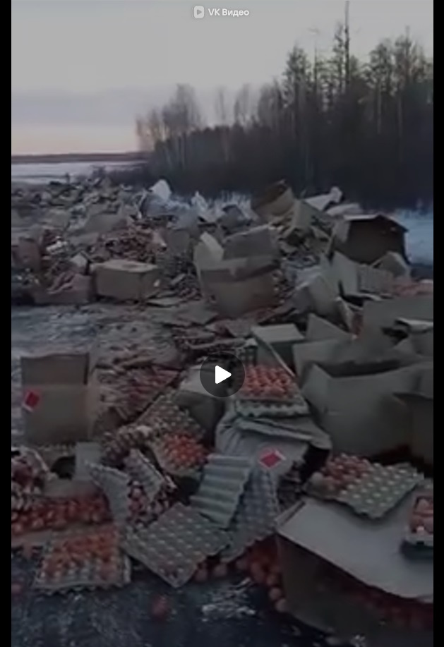 "Ведется прямая трансляция. Трасса Чита-Хабаровск, 100 километров от Зеи. Перевернулась фура с яйцами. Народ уже набрался, уехали. Яиц тут очень много, все еще свеженькие, себе уже набрал коробочку, так что без обеда я не остался. Кому интересно - приезжайте, забирайте", - говорит автор видео.