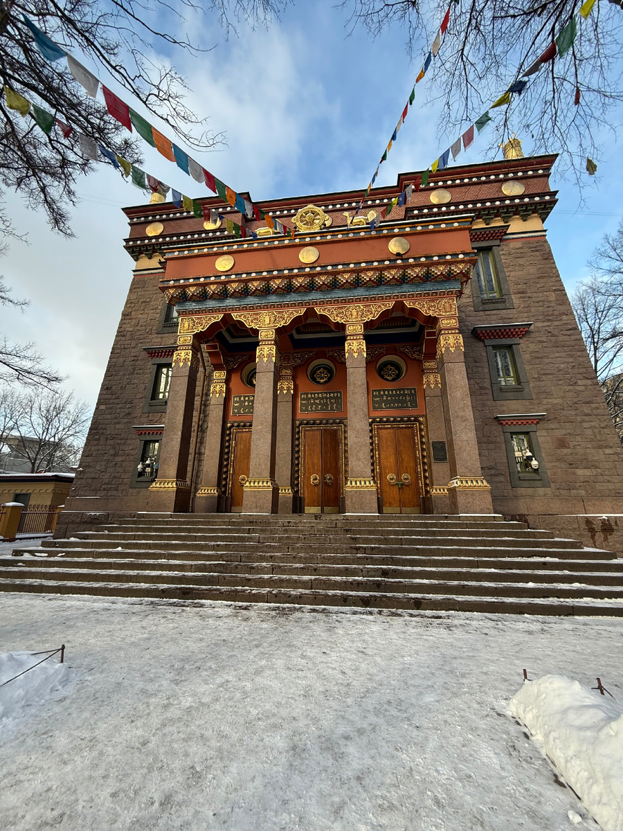 Это один самых северных в мире буддийских храмов "Дацан Гунзэ чойнэй", расположен он в Петербурге и был построен в годы правления Николая 2. Первое богослужение в еще недостроенном Дацане было проведено в 1913 году. Войти в Дацан может любой человек, вне зависимости от вероисповедания. Посетить этот храм стремятся многие туристы. Для исцеления кармы и исполнения желаний нужно крутить специальные барабаны, в которых заключены мантры. В архитектуре Дацана органично сплелись классические тибетские каноны и элементы северного модерна. Четыре колонны у входа означают благородные истины. Львы у входа в храм - символы мужского и женского начала, идеи о единстве противоположностей. За свою историю храм переживал не лучшие времена и закрывался по решению властей, здесь располагались разные организации. Удивительно, но при обстреле Ленинграда в период второй мировой войны ни один снаряд в здание не попал.