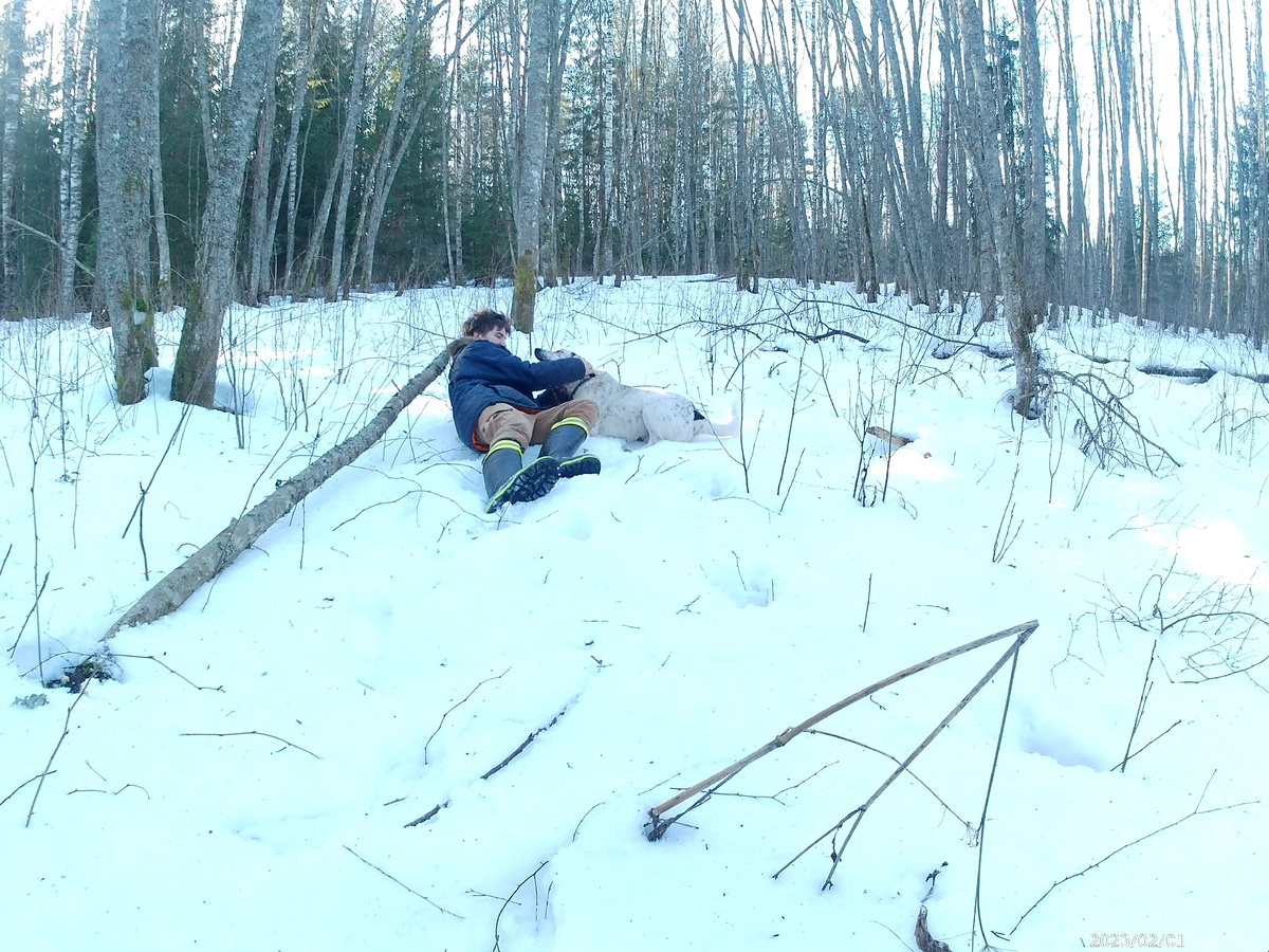 На праздник Крещения Господне, выспавшись после ночной службы, пошли наши "жихари" прогуляться по лесу. После долгой зимней оттепели, ударили небольшие морозы, а это значит, в лесу не мокро и можно идти без лыж. По пути в лес, мы встретили жителей нашей деревни, которые тоже решили погулять: https://vk.com/public221833529?w=wall-221833529_1808 Углубившись в лес, мы дошли до заболоченной речки, через которую нужно искать переход. А перед тяжелым переходом, можно немного отдохнуть и поиграть с нашим псом Алтаем. Прежде чем искать переход, мы решили подойти по ближе, к бобровой хатке,которая стоит на притоке реки Марковки, через который нам нужно перейти. (В видео, этот приток, я ошибочно назвали рекой Марковкой) После осмотра хатки, мы пошли искать переход через заболоченную речку. Пока искали переход через болото, Егор неудачно прыгнул через ручей. Наконец то, нашли такое место где болото заросло кустарником, а в доль него можно было перейти через речку. Перейдя через руч