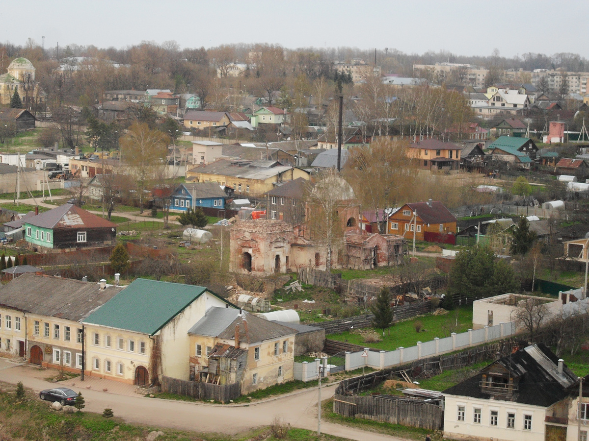 Но вот там оказалось действительно интересно. И видно, что идут работы по приведению в порядок и храмов, и всей территории. А главное — мы там поднялись на обзорную площадку на колокольне. Виды с неё открываются классные. Торжок на самом деле находится в очень живописных местах. Кстати, подъём на башню не бесплатный. Всего 100 руб. — но принимают только наличные. Мы едва нашли нужную сумму — уже давно наличкой почти не пользуемся.
