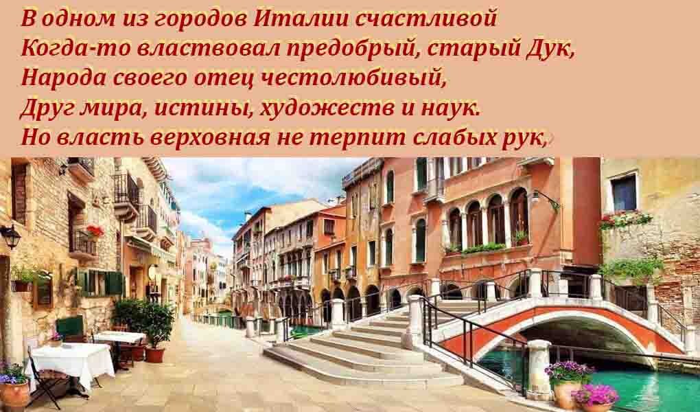 Любил Италию и Александр Сергеевич Пушкин, не раз он писал свои волшебные строки об этой прекрасной стране. В 1833 году Александр Сергеевич пишет поэму «Анджело». Позже Пушкин писал: «Наши критики не обратили внимания на эту пьесу, и думают, что это одно из слабых моих сочинений, тогда, как ничего лучше я не написал…» И в этом состоит загадка поэмы. Зачем он её написал, что он хотел ей выразить? В тот период поэт был занят переводом на русский язык поэмы Уильяма Шекспира «Мера за меру», но неожиданно бросил перевод и стал писать «Анджело». Что сподвигло его бросить Шекспира и написать поэму. Сию загадку литературоведы разгадывают до сих пор. В незамысловатом, в общем-то сюжете сплелись в один клубок вопросы нравственности, закона, власти, милосердия.
