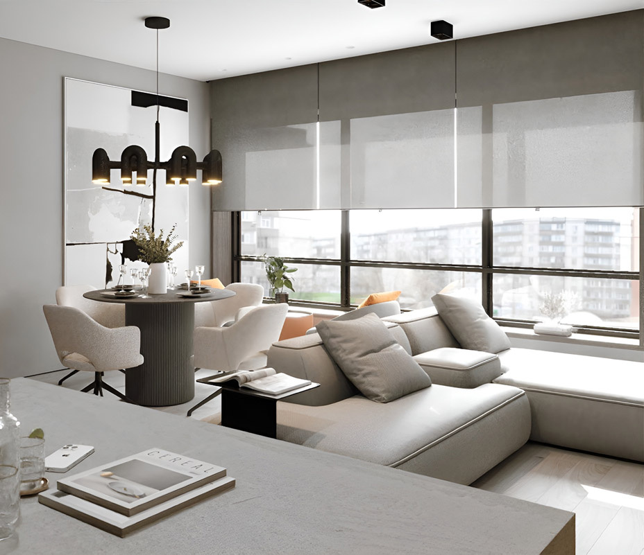 Гармония контрастов и функциональности сочетает интерьер современной кухни-гостиной, что позволило не только достаточно большая площадь в 34 м², но каждая деталь продуманная до мелочей. Кухонная зона как сердце этого пространства, в современном стиле минимализма и акцентом в черном цвете фасадов. Кухонный гарнитур от пола до потолка с черными фасадами выглядит строго и элегантно. В нем скрыты все необходимые места для хранения и встроенная бытовая техника, что делает пространство максимально функциональным. В углу кухни расположена рабочая поверхность в светлой отделке, которая контрастирует с черной раковиной и смесителем, добавляя интерьеру динамики. Над ней возвышается черная круглая вытяжка, которая, словно труба, тянется до потолка, подчеркивая вертикаль и создавая акцент на светлой стеновой панели из реек в светло-бежевом цвете. Потолочное освещение состоит из точечных светильников, которые зонально подсвечивают рабочую зону, делая ее удобной и уютной. В центре кухни расположен п