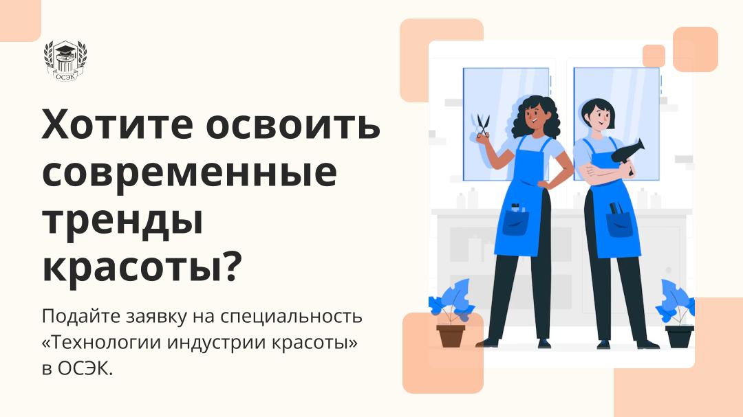 Вам доступны два направления на выбор: ✨ «Косметика» — макияж, оформление и окрашивание бровей и ресниц, уход за кожей лица и тела, эпиляция и депиляция. ✨ «Маникюр» — стрижки, окрашивание, химическая завивка, а также техники маникюра, педикюра и дизайна ногтей. Диплом ОСЭК дает возможность работать в салонах, начать свое дело или продолжить обучение в вузе на более простых условиях. Обучение проходит дистанционно: ✔Без привязки ко времени и месту. ✔С доступом к учебным материалам 24/7. ⏰Сроки обучения: ✔на базе 11 классов — 2 года 6