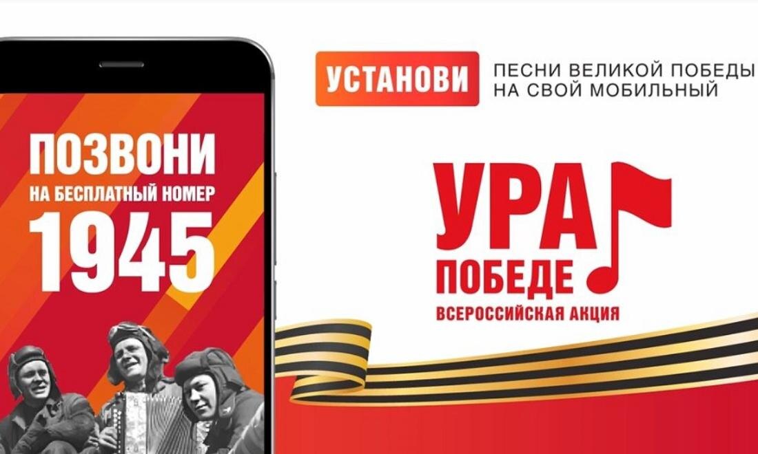 В год 80-летия Победы в Великой Отечественной войне проводят акцию «Ура Победе!», уже ставшую доброй традицией. Военные песни в мобильных телефонах – ещё одна дань памяти и уважения ветеранам. Масштабный мультимедийный проект продлится до 15 мая 2025 года. Чтобы принять участие в акции «Ура Победе!», наберите бесплатный короткий номер 1945. Далее с помощью интерактивного голосового меню выберите интересующий раздел. Так вы сможете узнать подробности об акции; прослушать ежедневные сводки Совинформбюро, зачитанные Юрием Левитаном; установить вместо гудков входящего вызова одну из легендарных композиций: «Тёмная ночь», «Катюша», «Прощание славянки», «Синий платочек», «Нам нужна одна Победа» (можно также получить ссылку для бесплатной загрузки этих песен на телефон и установить их в качестве мелодии звонка) или получить ссылку для загрузки логотипа юбилея Победы. Акцию проводят основные мобильные операторы – МТС, «Билайн», «Мегафон», T2 – при поддержке Министерства цифрового развития, свя