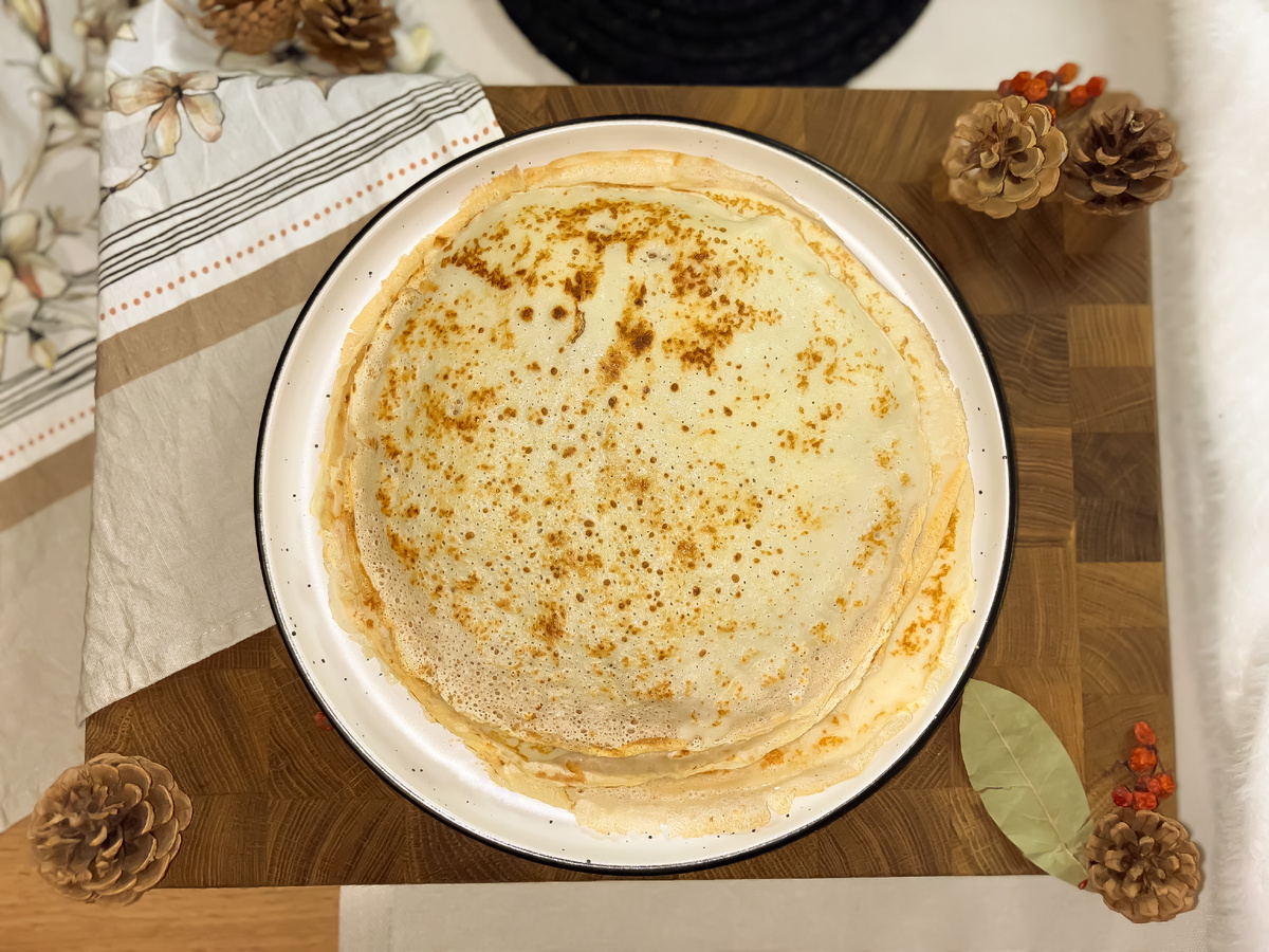 Уверена, что каждый любит домашние блинчики! Но как приготовить их так, чтобы они получились тонкими и вкусными? Сегодня я поделюсь с вами некоторыми секретами, которые помогут вам приготовить идеальные блинчики даже в первый раз. Если же вы планируете печь их часто, то советую приобрести специальную блинную сковородку. Ингредиенты: Приготовление: Разбиваем в глубокой миске яйца. Следите, чтобы скорлупа не попала в блюдо. Далее всыпаем сахар и соль. Размешиваем сначала венчиком, затем блендером на низких оборотах до воздушной пены. Добавляем молоко комнатной температуры. Смешиваем сначала венчиком, затем миксером до однородности. Муку просеиваем и делим на три равные части. По очереди добавляем в тесто муку и тщательно размешиваем миксером. Сверху поливаем растительным маслом по всей поверхности, чтобы добиться образования дырочек на блинах. Слегка размешиваем. Масло остается на поверхности. Разогреваем на максимальном огне блинную сковородку или берем ту, у которой самое тонкое дно