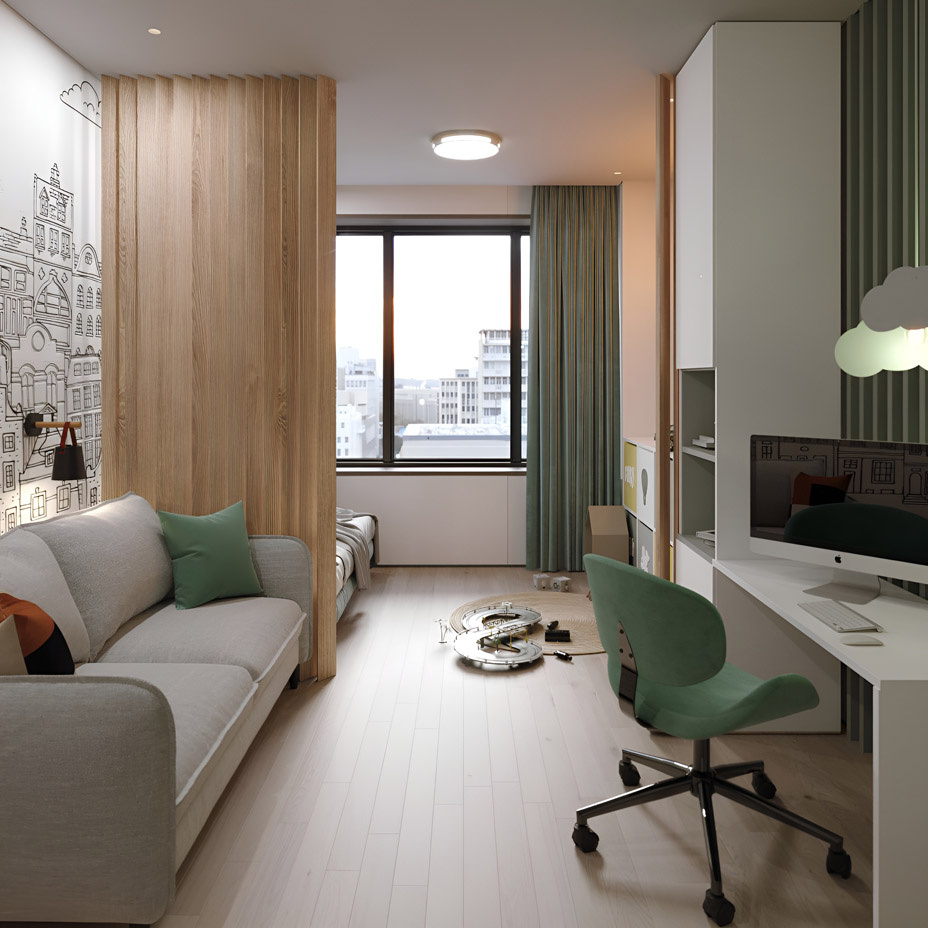 Детская комната для двух детей выполнена в светлом дизайне с акцентами на натуральные материалы и светлые цвета. Основная палитра интерьера построена на сочетании светлых оттенков, серой мебели и фактур натурального дерева, а акцентный зеленый цвет добавляет интерьеру живости и энергии. Одна из стен комнаты стала графичным акцентом: на ней изображен черно-белый рисунок города, который добавляет пространству динамики и современности. Эта стена разделена на две части деревянными ламелями, визуально видно зонирование детской комнаты для каждого ребенка. В каждой части у стены стоит диван-кровать в серой обивке, обеспечивая комфортное спальное место. Локальное освещение в виде настенных бра у каждой кровати создает уютную атмосферу и подчеркивает индивидуальность каждой зоны. Противоположная стена отведена под игровую и рабочую зоны. Игровая зона включает тумбу для хранения игрушек, а рабочая зона оборудована столом с компьютером. Стена здесь отделана деревянными рейками, окрашенными в зел