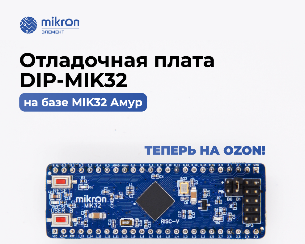 27 декабря Микрон, крупнейший производитель российской микроэлектроники (входит в группу компаний «Элемент»), резидент ОЭЗ «Технополис Москва», начал продажи отладочной платы DIP-MIK32 на базе микроконтроллера MIK32 Амур (К1948ВК018) на маркетплейсе Ozon. MIK32 Амур - первый полностью отечественный 32-разрядный микроконтроллер с ядром на архитектуре RISC-V, разработан и производится в России в группе компаний «Элемент», must have для инженеров-разработчиков и программистов, заинтересованных в промышленном применении отечественных устройств. Плата позволяет активировать микросхему и отработать схемотехнику изделий с применением микроконтроллера Амур, а также может быть использована для обучения основам программирования и электроники. Основное предназначение – быстрый выпуск прототипов устройств. Отладочная плата доступна в каталоге Ozon в категории Электроника/Микроконтроллеры. «Отладочная плата DIP-MIK32 представляет собой сменный микроконтроллерный модуль для использования в прототип