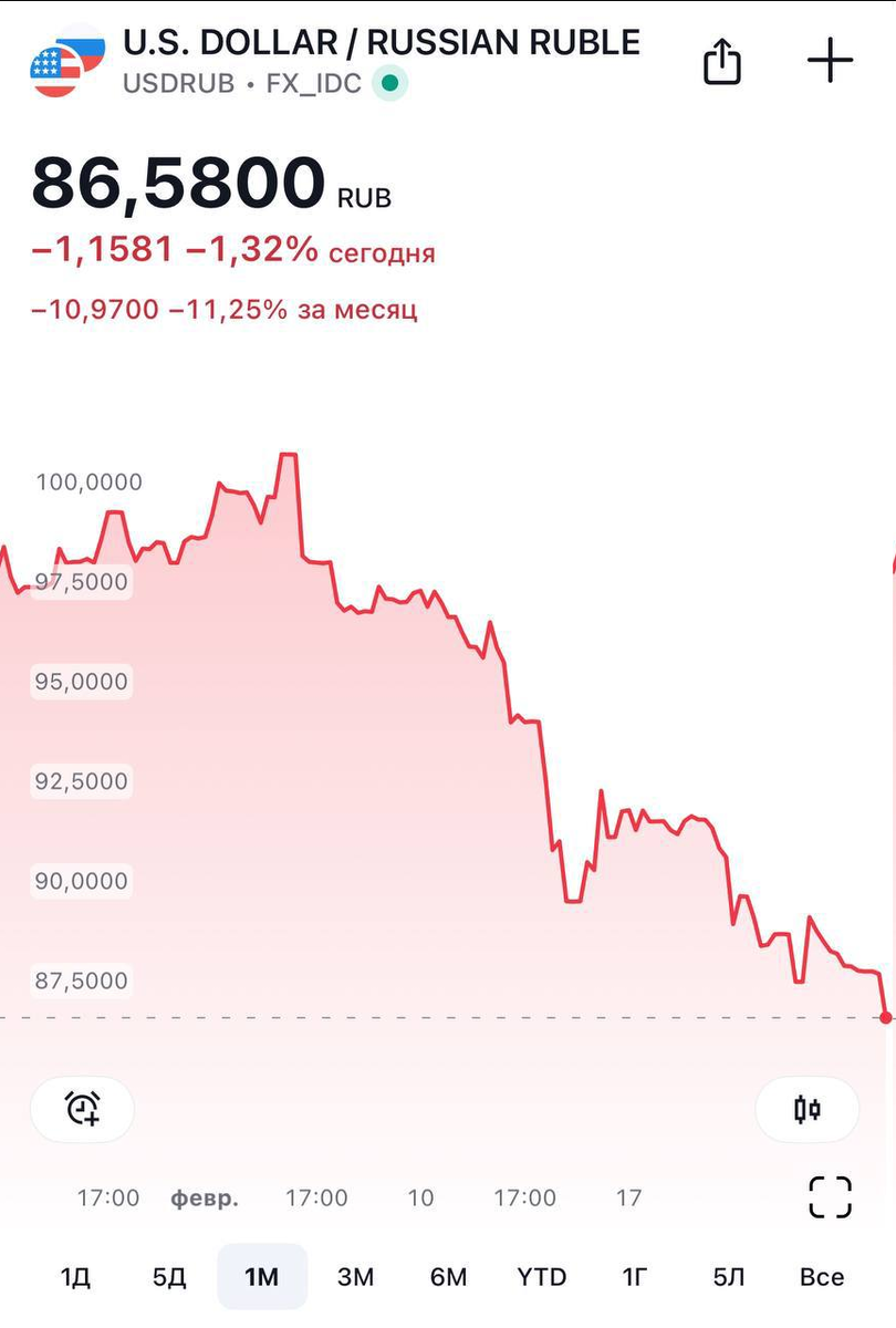 Отечественная валюта укрепляется, и сейчас курс юаня на бирже уже упал до 11,8 рублей. Давайте разберёмся, почему это происходит и чего ждать дальше. Почему рубль растёт? Главная причина — оптимизм на фоне разговоров о возможных мирных переговорах. Дополнительно США демонстрируют стремление к улучшению отношений с РФ, что косвенно подтверждается сближением позиций на трибунах ООН. Это повышает вероятность смягчения финансовых санкций в случае успешного урегулирования конфликта. Что дальше? Фундаментально рубль остаётся переоценённым: ◽️Слабый платёжный баланс. В январе экспорт товаров снизился на 1,3% (год к году), тогда как импорт вырос на 13,6%. В результате счёт текущих операций оказался в дефиците на $0,7 млрд. Норма для нашей страны — профицит, среднемесячное значение в 2024 году $4,5 млрд. ◽️Нет драйверов роста экспорта. Российская нефть подешевела с январских максимумов $77 до $68 за баррель. Дисконты на нее только расширились, впереди нас также ждет эффект от январских санкций,