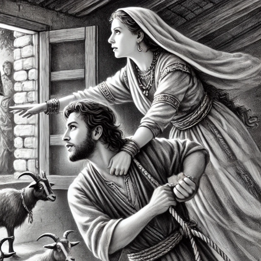 Мелхола, жена Давида и дочь Саула, спасает мужа, помогая ему сбежать. Она кладёт в постель статую, чтобы создать иллюзию, что Давид спит, а затем говорит воинам, что он болен. Этот обман даёт Давиду время скрыться. Саул, обезумев от гнева, не только продолжает преследовать Давида, но и идёт против Бога.