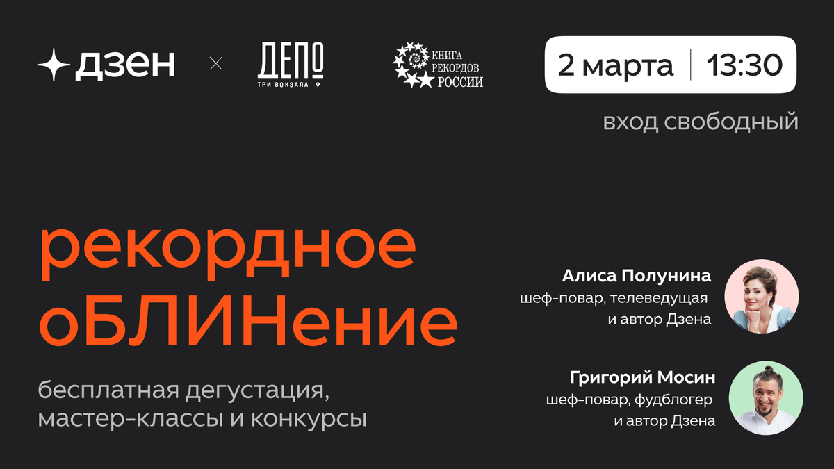 Друзья, 2 марта в 13:30 приглашаю вас праздновать широкую Масленицу в самом сердце гастрономической Москвы – в «Три вокзала. Депо»! Будет шумно, весело и, конечно же, очень вкусно! Мы вместе с Дзеном и моим коллегой по цеху, шеф-поваром Григорием Мосиным, а также с нашими командами крутых поваров, собираемся побить рекорд России по выпеканию блинов – и испечь… даже страшно произносить эту цифру…более 1000 блинов за 1 час! Да-да, вы не ослышались! Это будет своего рода «челлендж», где два шеф-повара с разными подходами к приготовлению блинов будут работать вместе для достижения общего результата! Официальные представители Книги Рекордов России будут фиксировать это достижение, следуя строгому регламенту. Они будут следить за каждым нашим движением, за каждым румяным бочком. С момента старта мы коснемся половников, а в момент финиша вся аппаратура выключится – допекать блины после этого запрещено! В результат будут засчитаны только полностью испеченные блины. Его диаметр составлял почти