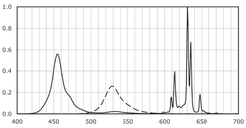 Компания Nichia (Япония) представила светодиод NS2W806HT-B2, в котором используется новый подход к формированию белого цвета. В светодиоде имеется чип синего свечения, покрытый люминофором, дающий красный свет. Кроме этого, есть еще и чип, дающий зеленое свечение. Белый цвет получается посредством сложения излучения от синего и зеленого чипов, а также от красного люминофора. В номинальном режиме на синий чип подается ток 20 мА, на зеленый подается 10 мА. Падение напряжения на чипах составляет соответственно 2,75 и 2,33 В. Световой поток при этом равен 10,6 лм, т. е. светоотдача, с учетом энергопотребления обоих чипов, оказывается на уровне 135 лм/Вт. На рисунке показан график зависимости относительного значения спектральной плотности излучения от длины волны, выраженной в нанометрах. Непрерывная линия — суммарное излучение синего чипа и люминофора, пунктирная линия — излучение зеленого чипа. Новинка предназначена для подсветки экрана в телевизорах и компьютерных дисплеях. Ожидается, ч