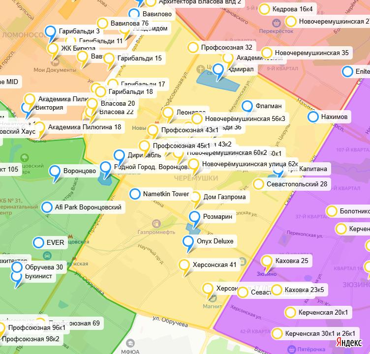 Друзья, добрый день, продолжаем с Вами цикл статей про Юго-Запад Москвы. Мы с Вами уже рассмотрели Раменки, Воробьевы Горы, Тропарёво-Никулино, Ломоносовский и Обручевский районы. На очереди - Черёмушки. Вас (как и меня) может смущать, что Новочеремушкинская тянется куда-то далеко на север, в Академический район, и там же расположен, к примеру, парк "Новые Черёмушки", но на самом деле, традиционные Черемушки именно оттуда, со станции метро "Академическая" и начинались и только позже сместились на юг. Тем не менее, "смещение" коснулось исключительно административных границ, а жилой массив до сих пор фактически один - на север, как минимум, до ул. Дмитрия Ульянова плюс примыкающая часть Зюзино. Район хороший, с развитой социальной инфраструктурой и хорошей транспортной доступностью по оранжевой ветке и БКЛ. Разнообразный жилой фонд. Много индивидуальных проектов лужковской эпохи, начиная с легендарного "Дома Газпрома" 1997 года постройки и, заканчивая ташировским "Розмарином" 2012. Зас