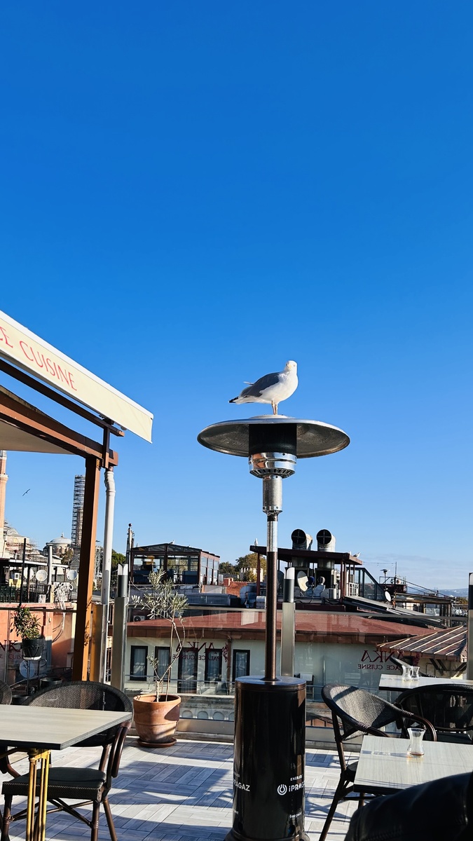 Что туристы так любят в Стамбуле? Крупных и довольно нахальных чаек! За одной такой мы наблюдали по приезду, она шла куда-то по своим делам, но потом развернулась и вспомнила, что дела в другой стороне и потопала обратно😁 Завтракать с чайкой тоже очень приятно, если она к тебе не пристает.