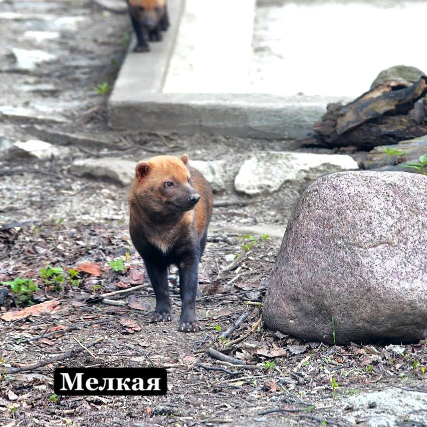 Сегодня рубрика #героймесяца погружается в тонкости социальной жизни собачьего коллектива. Группа из семи кустарниковых собак, живущая в нашем зоопарке — это классическая собачья стая: есть лидер, она же — альфа-самка, есть низший в иерархии, а остальные — посерединке. Нашу альфу зовут Мелкая. Она и правда поджарая и миниатюрная. Такое телосложение делает ее самой быстрой и ловкой в стае. Альфа — заводила, альфа — всегда впереди, если нужно исследовать что-то новое. Коллеги, близко знакомые с собаками, говорят, что нам досталась приличная альфа, не хамовитая, скромная и адекватная. Альфа-тиран и самодур — горе семье. Низшую иерархическую ступень занимает Полоска. Она самая младшая в группе и самая трусливая. Чтобы Полоска поела, киперам приходится придумывать разные ухищрения, иначе, стая беспринципно съест всю Полоскину еду. Узнать Полоску легко: она вечно мнётся в дверях, потому что заходить внутрь страшно и выходить наружу тоже боязно. Когда Полоска заходит в бассейн, товарки хватаю