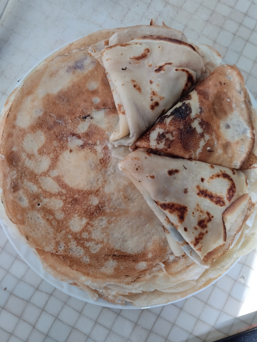 У каждой хозяйки свой рецепт блинов. В моей молодости блины пекли без какого то конкретного рецепта, и сколько я не пыталась напечь вкусных блинов у меня всегда получались разные вкусы. Я стала искать свой рецепт. И мне удалось, рецепт был взят из настенного отрывного календаря. Раньше интернета не было. Этот рецепт лёгкий, всегда получается вкусно. Мой старший внук с восьми лет пёк со мной блины, ему было сложно поднимать чугунную сковороду, но завести тесто , наливать его на сковороду и переворачивать блины легко. Вот все что нужно для приготовления, но здесь нет ещё масла растительного и сливочного. Все продукты соединить в чаше для теста. Вылить один стакан молока. Всё хорошенько перемешать,чтобы было поменьше комочков. Вылили остатки , 2 стакана ( молоко или вода). Всё хорошенько перемешать. Не забываем добавить две столовые ложки растительного масла Тесто получится жидким, как раз такое как нужно. Пока тесто отдыхает,готовим сковородку. У меня чугунная , она самая удобная
