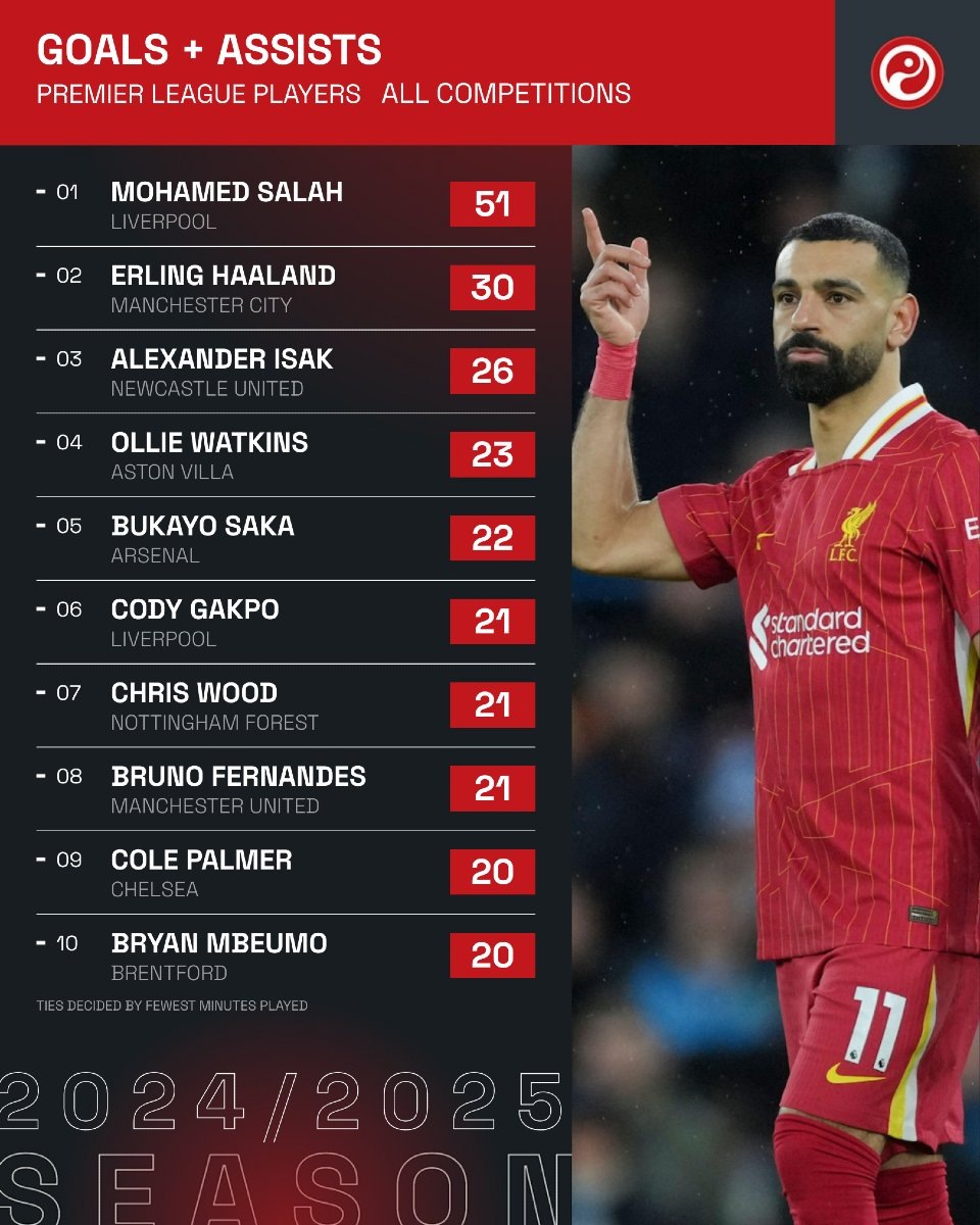 🔥 Салах – лучший игрок из АПЛ по гол+пас во всех турнирах. А кто еще в топ-10?