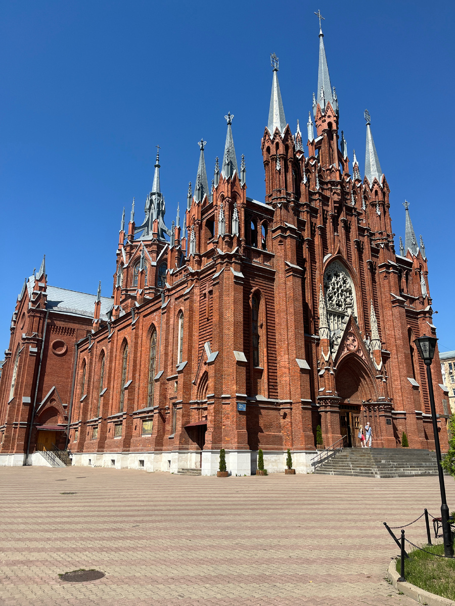 Москва совершенно бездонна в плане архитектурного наследия, на её подробное исследование понадобилось бы пара месяцев ежедневных прогулок. Поэтому перед редкими (увы) трипами сюда я составляю список отдельных достопримечательностей, которые надо обязательно посетить. После визита в прекрасное Кусково мы отправились к шикарному неоготическому костёлу на Малой Грузинской улице (недалеко от метро Улица 1905 года).