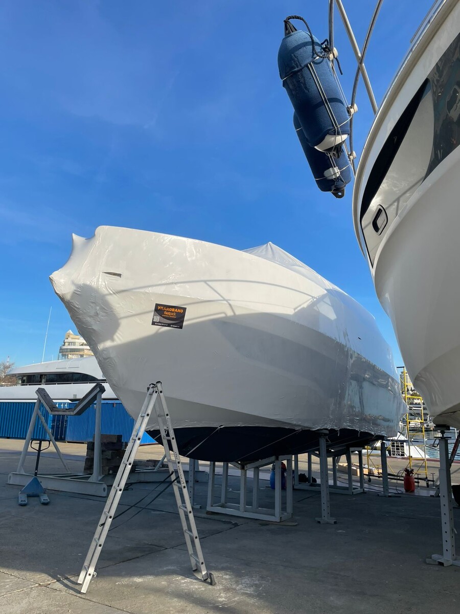 Упаковка яхты в белую пленку из полиэтилена высокого давления