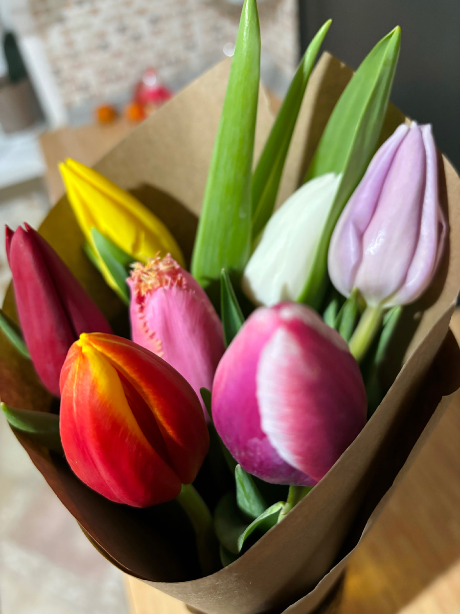 Понедельник, вечер. Я ношусь по квартире, пытаясь успеть всё, что планировала сделать в течение дня. У Ксюши были другие планы на мамулькины дела, она всегда как будто чувствует, что у меня запланировано объять необъятное и устраивает концерты в стиле «возьми на ручки, полы подождут». Очень жду спасения — прихода мужа с работы, в надежде успеть хотя бы расчесаться за весь день, не говоря уже о полноценных сборах на день рождения в ресторан. Приходит мой спаситель, в руках держит газетку, из тех, которые в почтовые ящики постоянно кидают. Протягивает эту газетку, зная, как я их не люблю, и говорит: «Ирусик, забери газету, я пока разденусь». Я уже приготовилась возмущаться, мол, на кой хрен ты их постоянно домой тащишь, стоит же коробка на первом этаже для макулатуры, нет, надо всё в дом нести! Не дав мне вывалить свои возмущения, муж раз! и развернул руку, а там за газеткой букет тюльпанов. — Это тебе! — Мнеееее?! Так не у меня же День рождения, у Валюши. — Так это не с Днем рожде