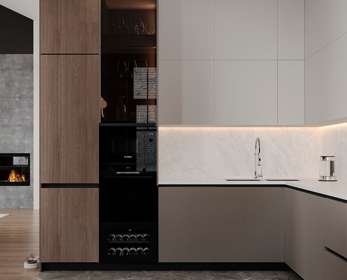 Особое внимание стоит уделить внутреннему углу кухни. В зависимости от вашей планировки, может возникнуть необходимость в использовании двух видов открывания дверей: распашных и газлифтов. Распашные дверцы отлично подойдут для стандартных шкафов, в то время как газлифты обеспечат легкость и комфорт при открывании верхних ярусов, особенно в ограниченном пространстве. При планировке кухни важно учитывать не только эстетические, но и функциональные аспекты. Одним из ключевых моментов является правильное размещение ящиков и шкафов с техникой. Рекомендуется располагать шкафы с техникой на расстоянии как минимум 500-600 мм от внесшего угла кухни. Такое расстояние позволит вам комфортно использовать угловую часть, обеспечивая свободный доступ к необходимым предметам и технике. Кроме того, это поможет избежать ощущения стеснения и создаст более удобное пространство для работы.