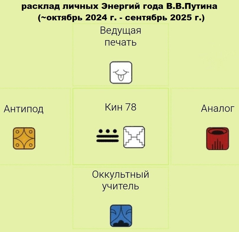 Здравствуйте все! Когда я вычислил текущие "личные Энергии года" ВВП.. Знаете, я аж вздрогнул! Тут необходимо сделать пояснение: такая реакция была следствием не конкретно "раскладом" ВВП, сколько ощущением того, как приятно всё таки приоткрывать, хотя бы иногда, тайны Мироздания, ощущать Дыхание, Пульс Самой Вселенной.. Воочию, буквально наглядно лицезреть то, насколько всё взаимосвязано, взаимо обусловлено! Спойлер!) В предыдущей "серии" - я сделал "расклад" Личных Энергий года Трампа, и в конце поста я сделаю анализ сочетания Энергий ВВП и Трампа. Но, ближе к делу!) Так "совпало", что у Владимира Владимировича этот его Личный год (октябрь 2024 - сентябрь 2025 гг.) - так же является завершением 13-ти летнего цикла, ИТОГовый!) Основные две Энергии года выпадают на КИН 78: ЭЦНАБ 13. Кстати, "78" - это автомобильный код региона "Санкт-Петербург", родного города ВВП.. Но это - уж точно совпадение ))) Итак! "13" - это Итог. Реализация. Завершение. Знак "ЭЦНАБ" (белый, в цент