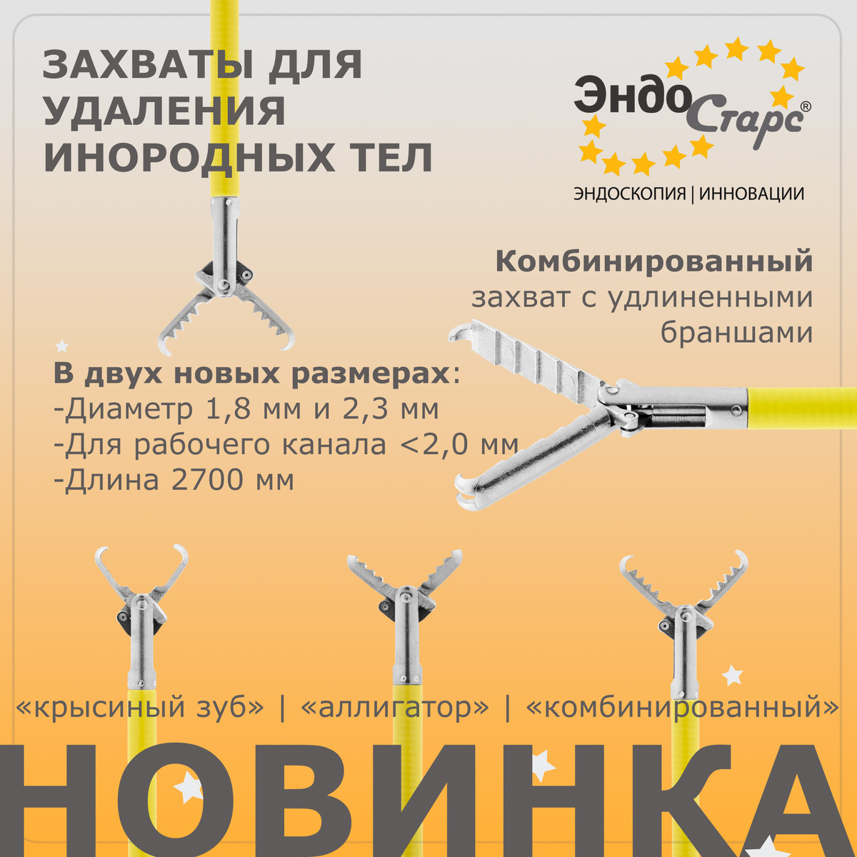 Уважаемые коллеги, Представляем вашему вниманию захваты для удаления инородных тел. Повышенная точность смыкания браншей обеспечивает надежное и быстрое извлечение инородных тел. Захваты для удаления инородных тел — это надежный инструмент для эффективного удаления объектов в ходе эндоскопических процедур. 📌Доступные типы: - «крысиный зуб» - «аллигатор» - «комбинированный»/ «аллигатор с крысиным зубом» 🆕Комбинированный захват с удлиненными браншами теперь в двух новых размерах: диаметром 1,8 мм и 2,3 мм. 🎯Характеристики новых моделей: - Длина 2700 мм, для рабочего канала 2,0 мм и более - Изделие однократного применения - В упаковке: 10 штук 💬Более подробную информацию можно получить на сайте endo-stars.ru: +7 (812) 600-25-26 (многоканальный) +7(800) 555-56-57 (бесплатный звонок по России) Email: info@endo-stars.ru Всегда Ваши, Эндо Старс🌟